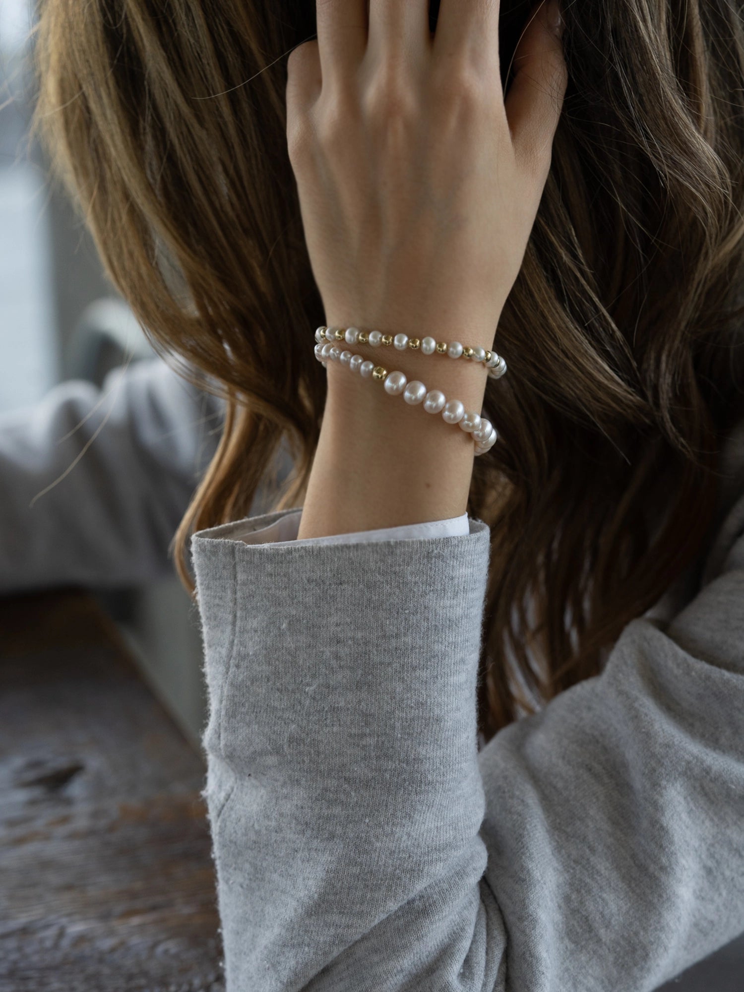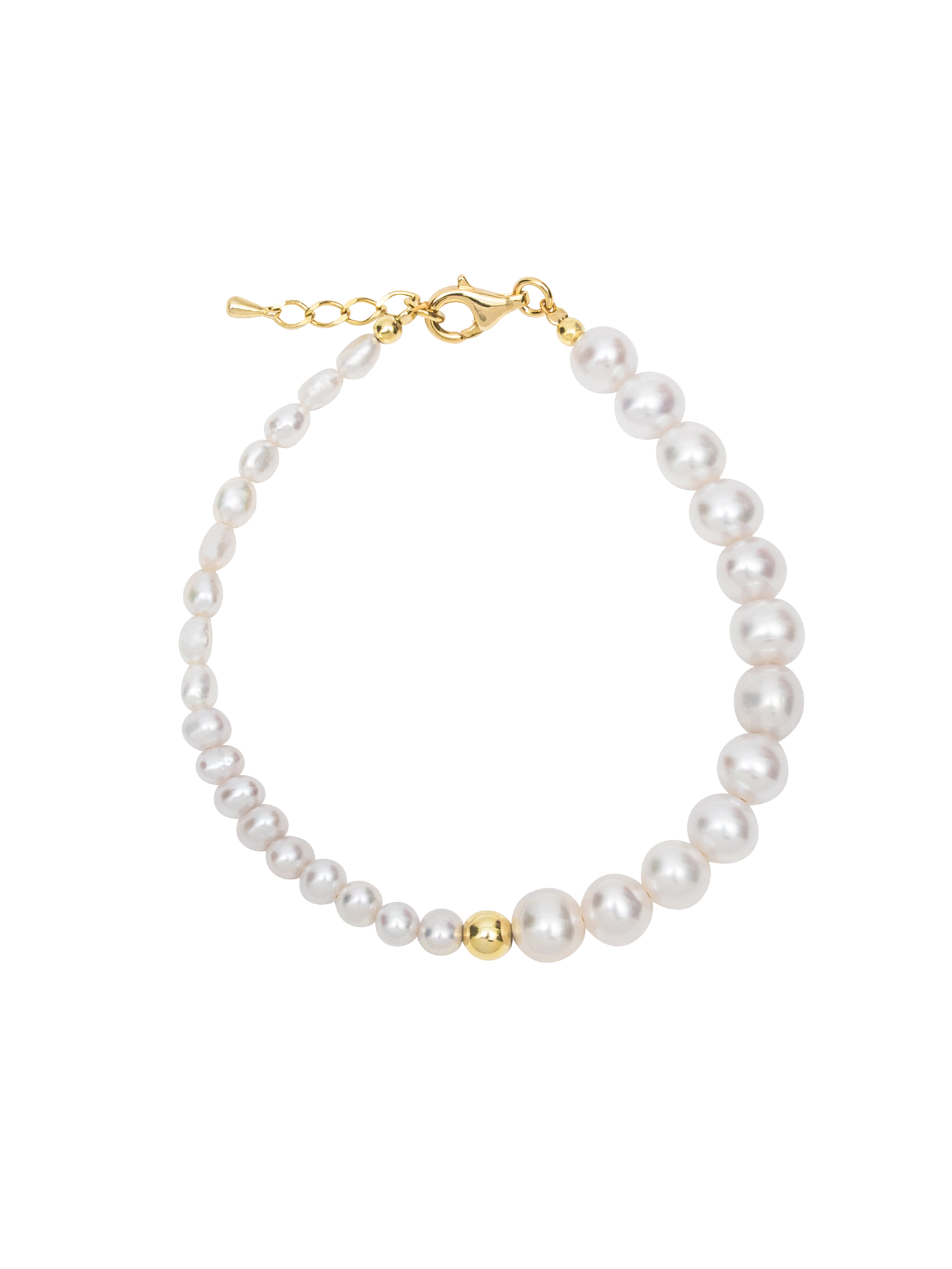 The perfect addition to a stack on your arm. This asymmetrical design includes tiny baroque pearls mixed with near round pearls to form a unique and natural appearance.