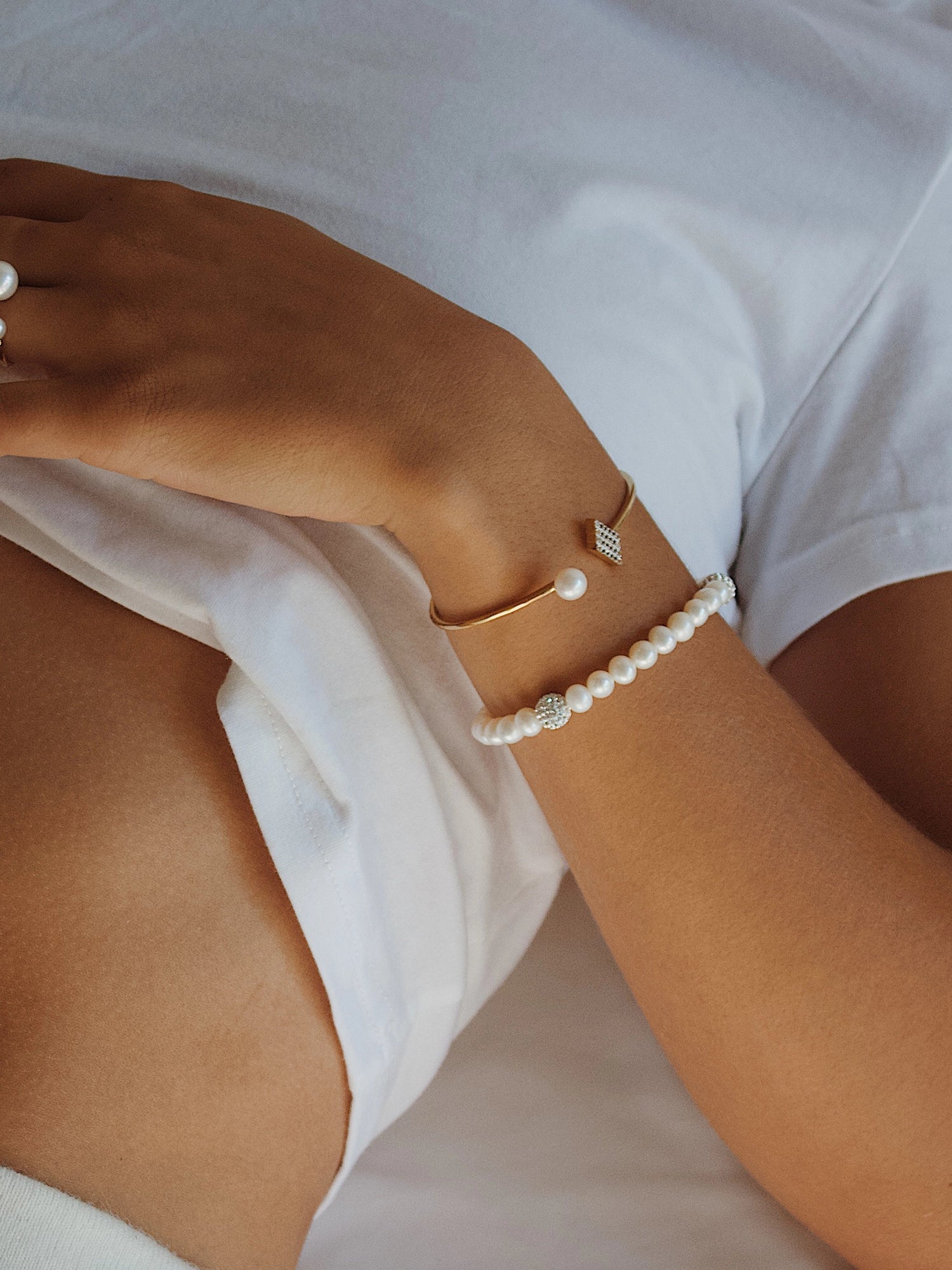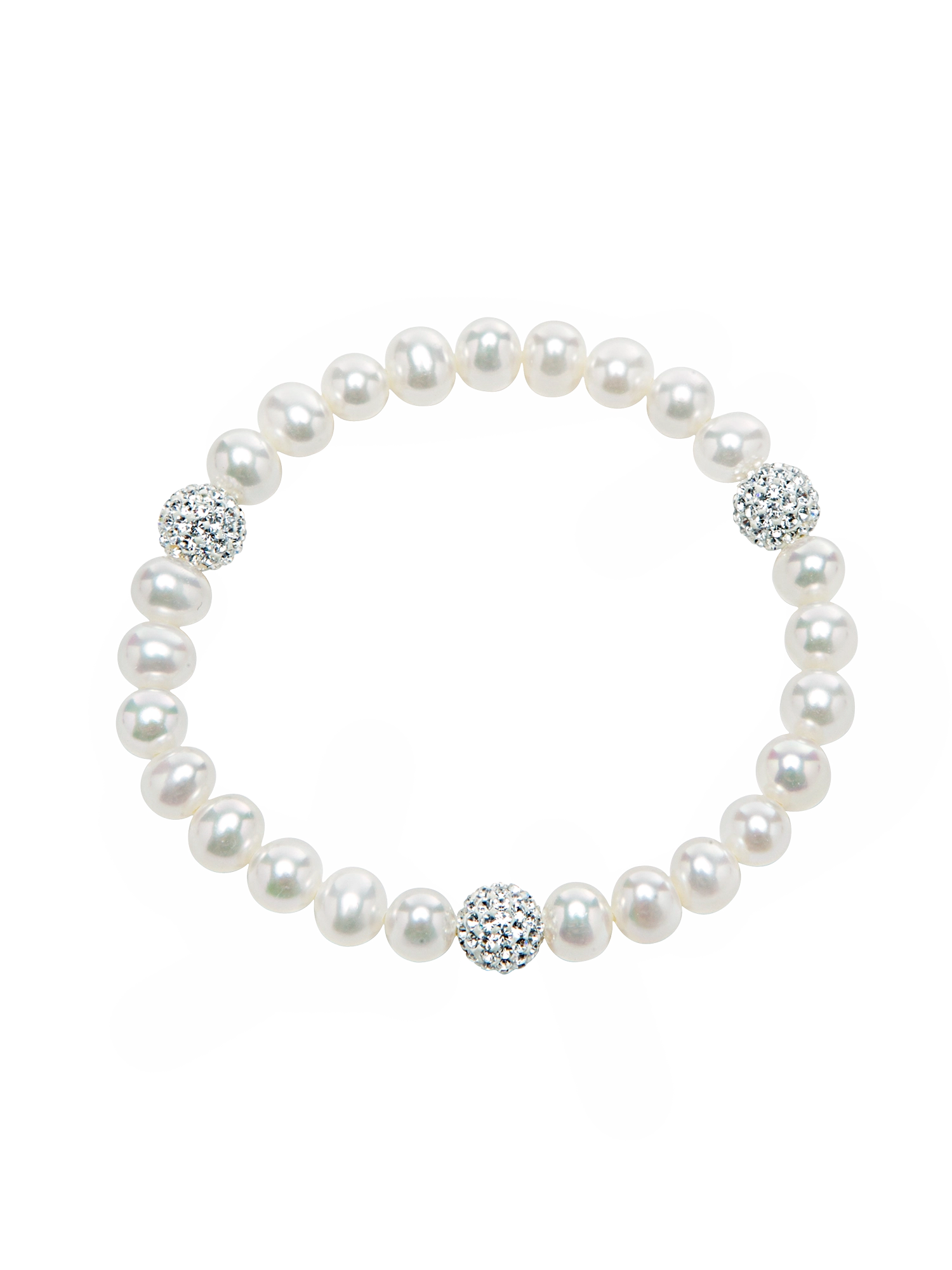 Crystal beads add a playful touch of luminosity to this elegant design, complementing the luster of luminous freshwater pearls. Strung on a soft elastic thread, it offers a secure, lightweight fit. Perfect for all-day comfort and any occasion.