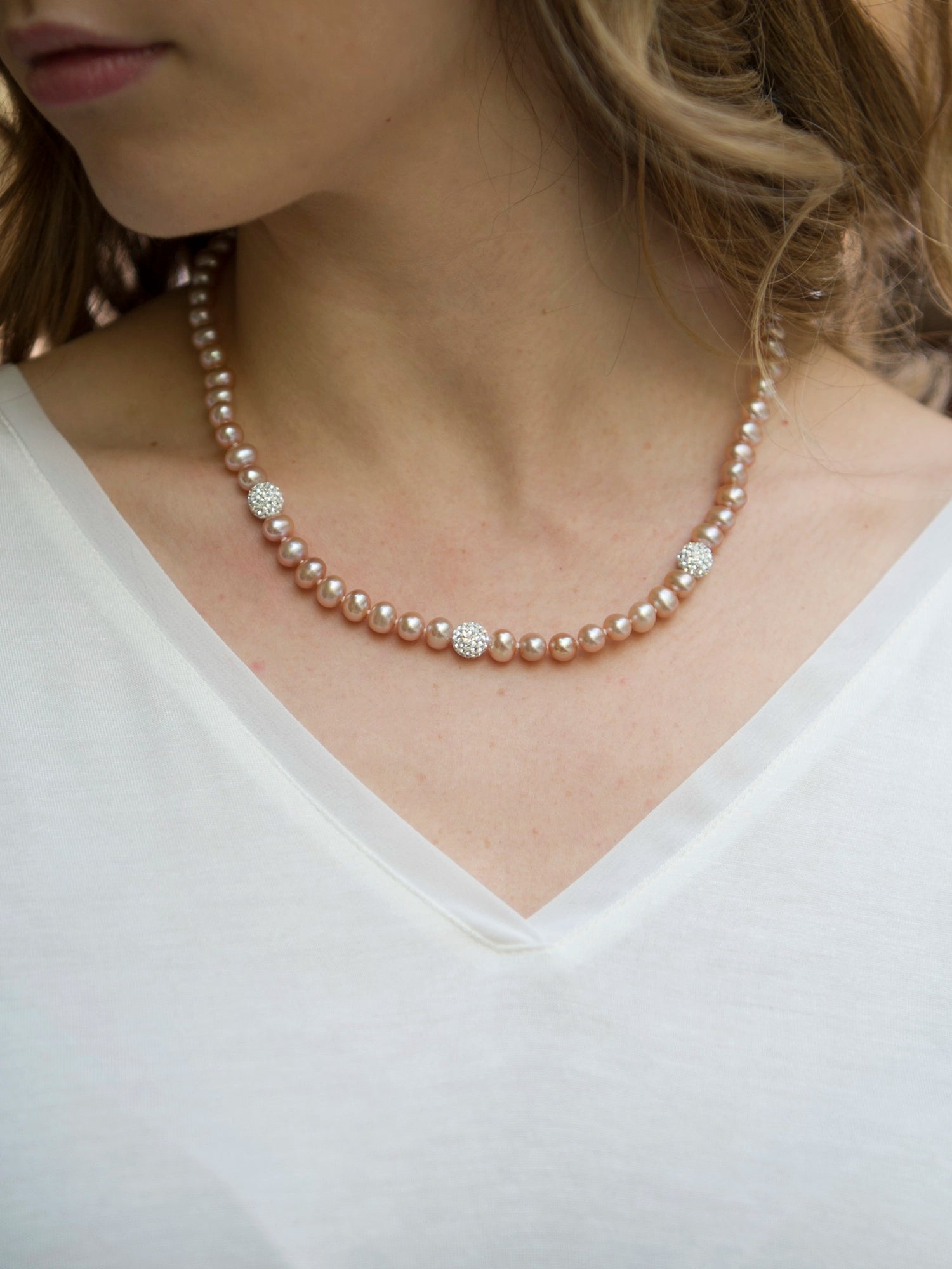 Complementing the luster of luminous freshwater pearls, crystal beads add a playful touch of luminosity in this elegant design.