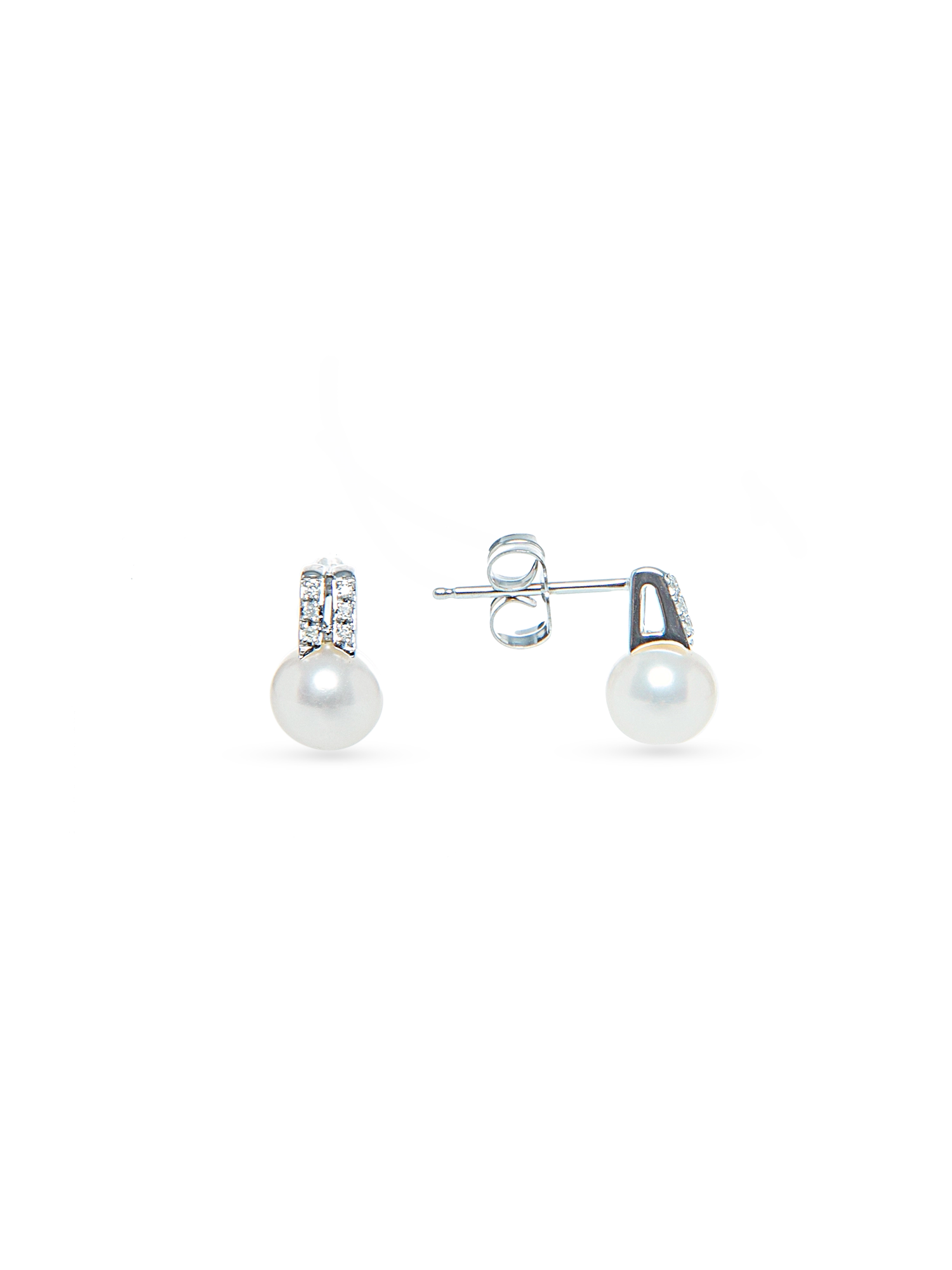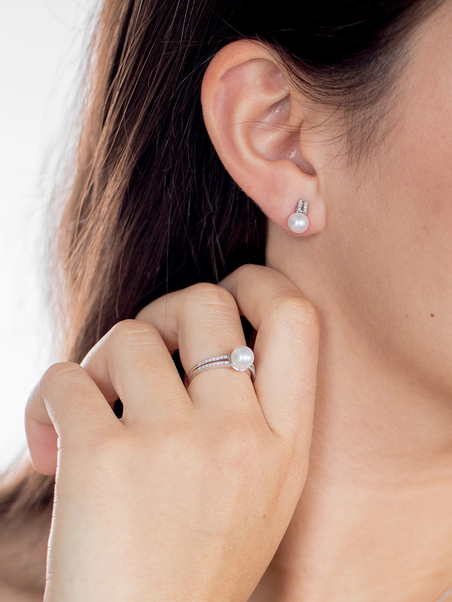 Lustrous round freshwater pearls beam from beneath rows of diamonds in a minimal and mesmerizing design.