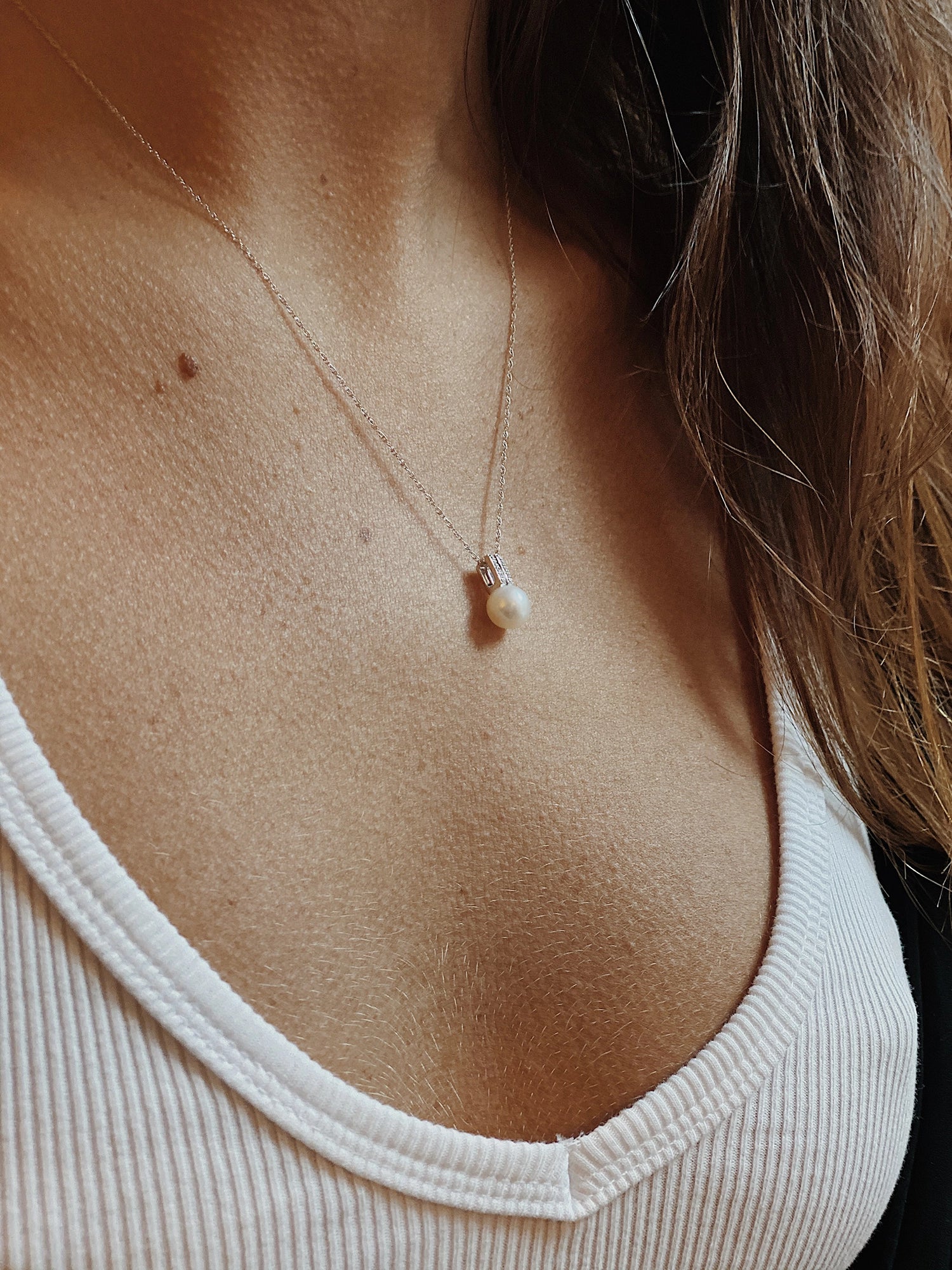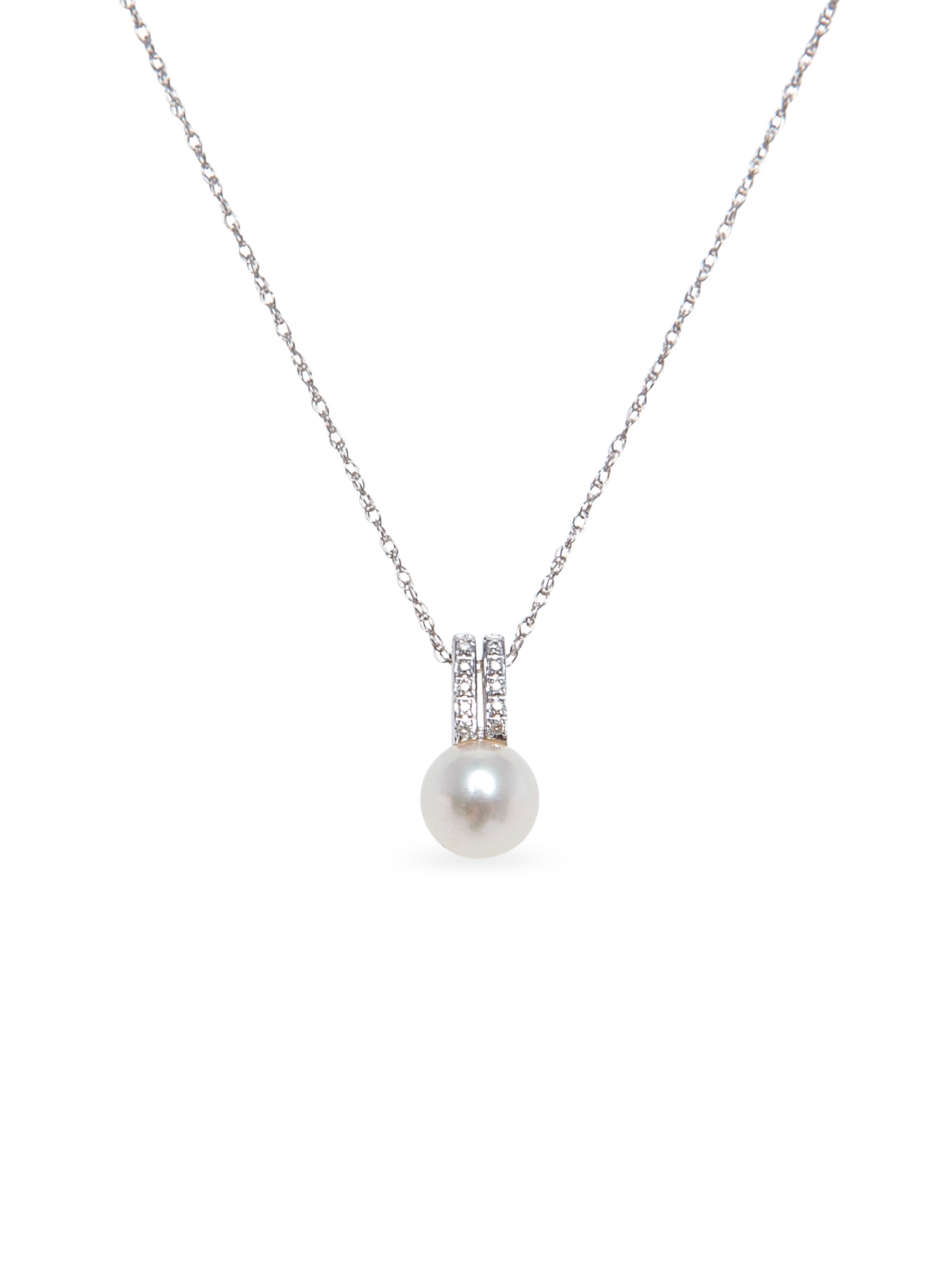 A lustrous round freshwater pearl beams from beneath two rows of diamonds in a minimal and mesmerizing design.