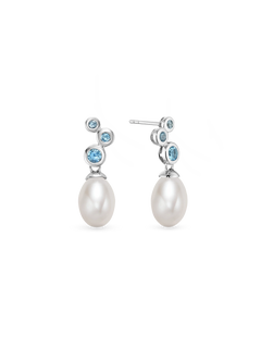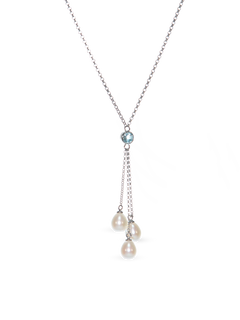 A splash of blue, a drop of glow. With three shimmering stones and a luminous pearl, this pendant is pure cool-girl energy.