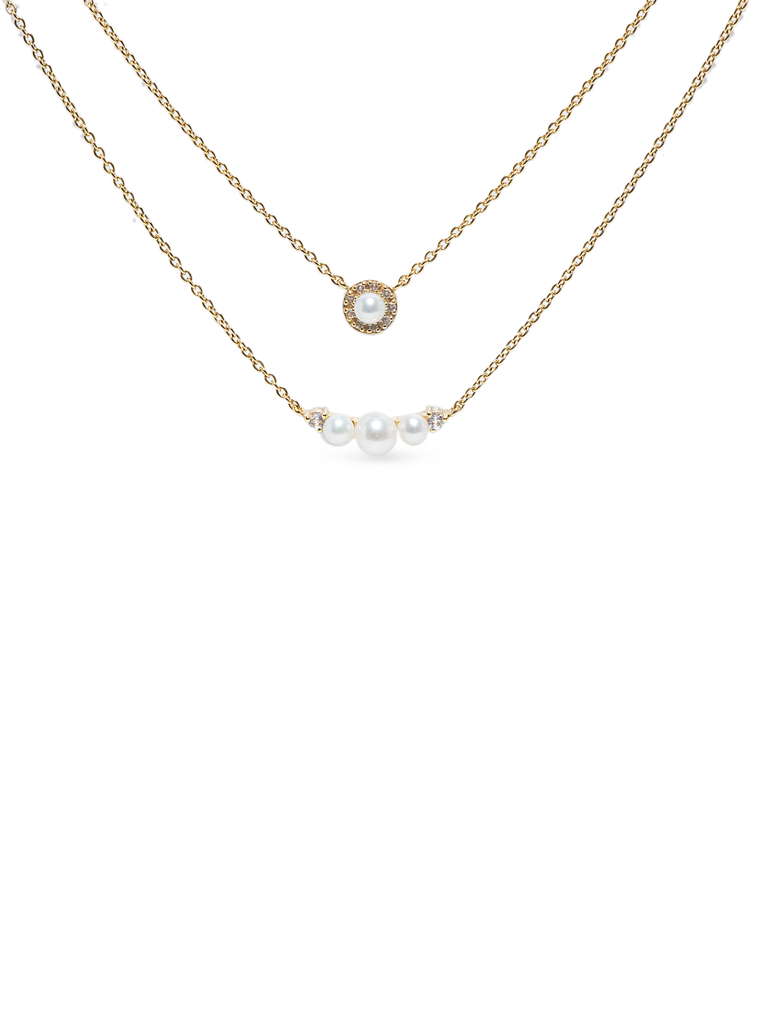 Double the chains, double the fun, two chic chains, one topaz-bezel pearl pendant, and three pearl-white topaz accents make layering easy.