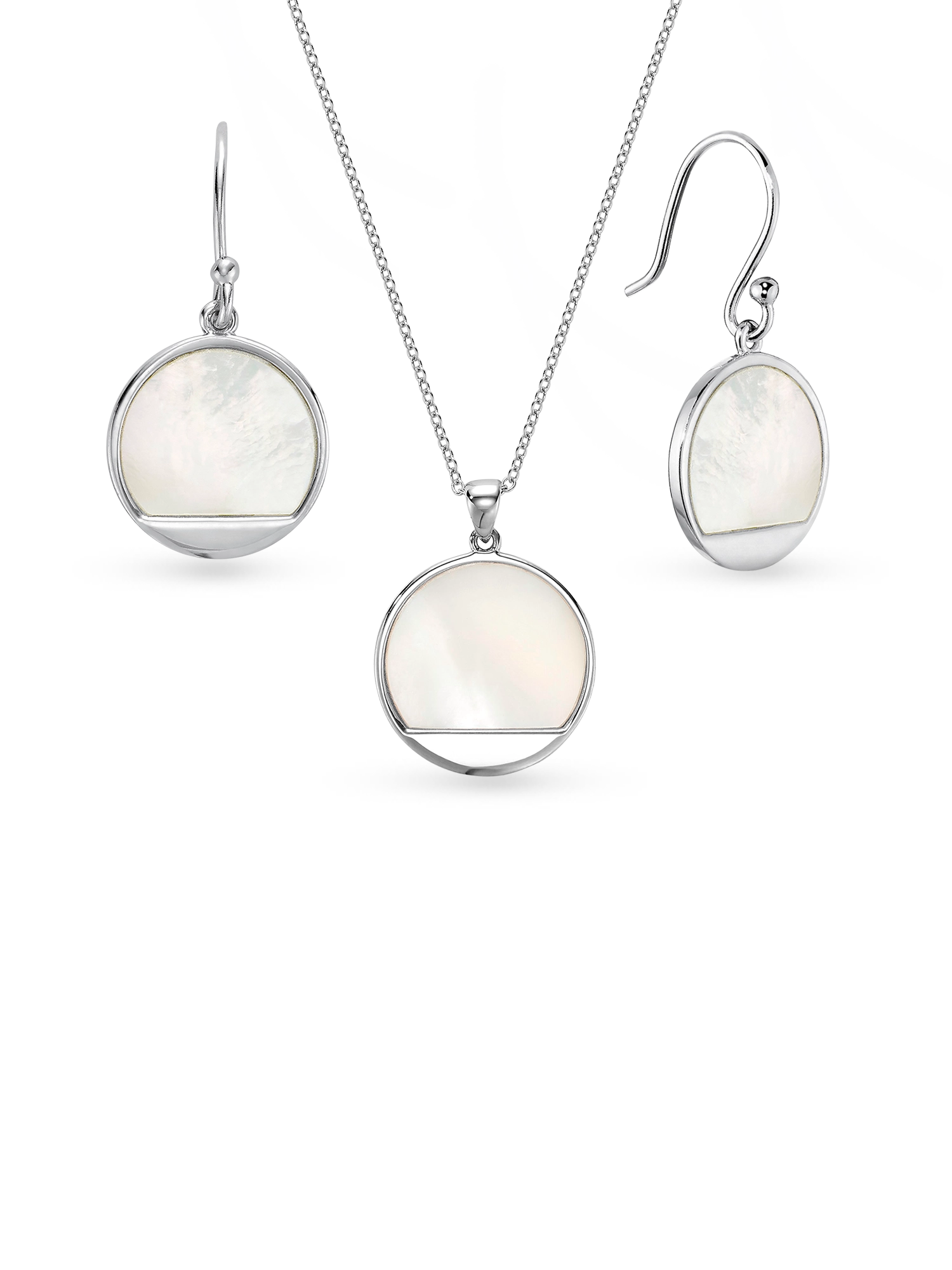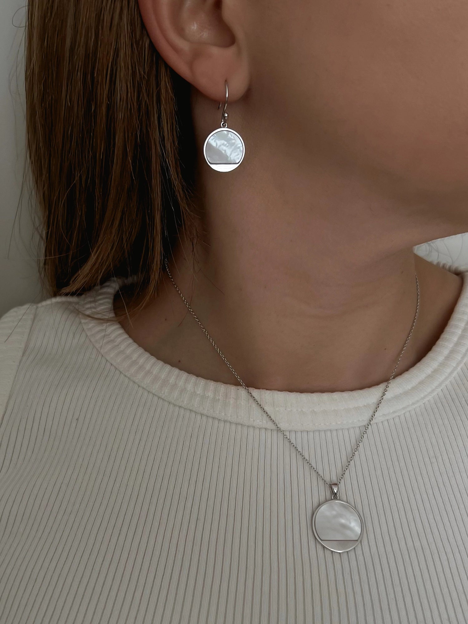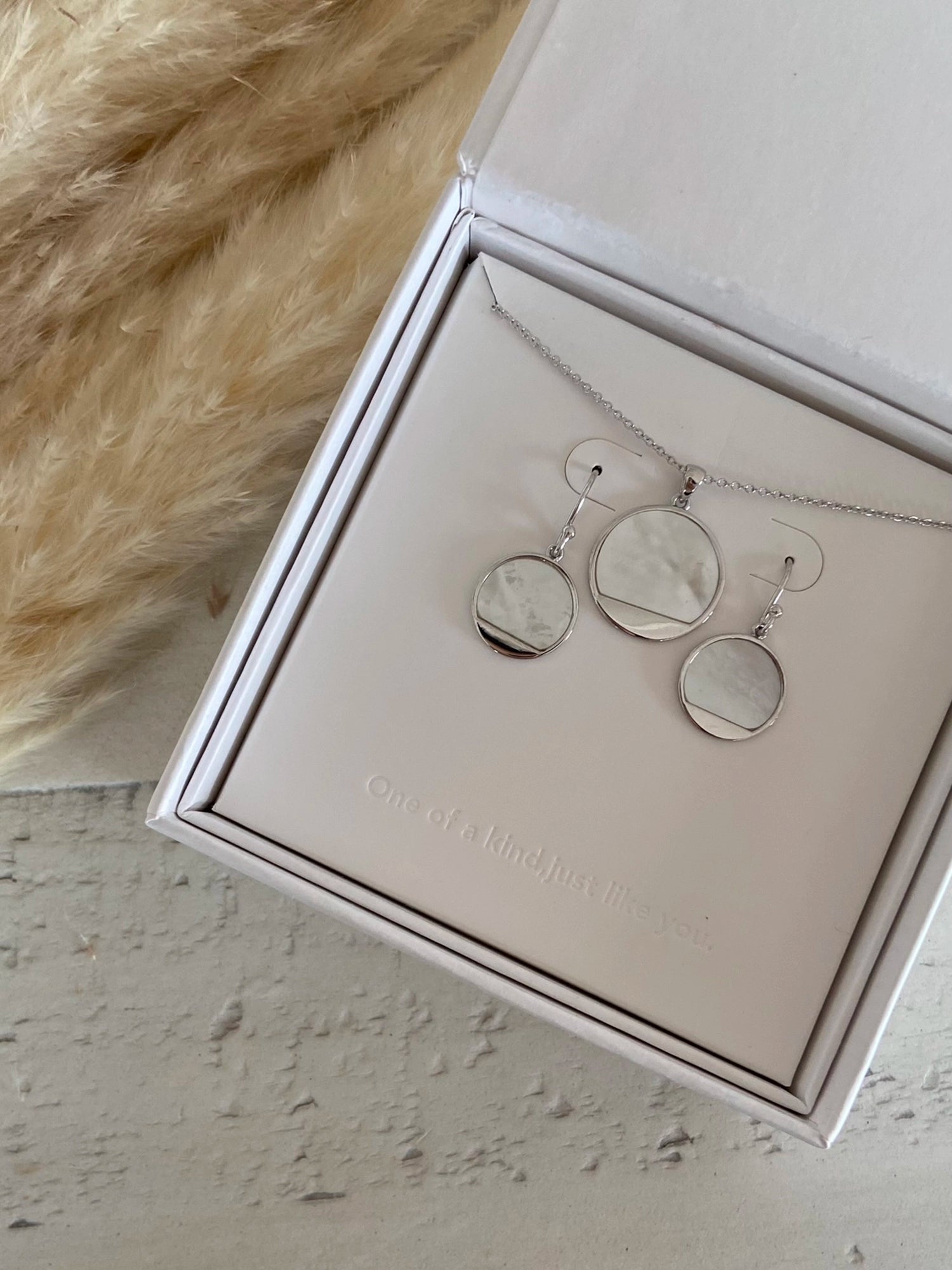 Irresistibly iridescent: These gems will steal the show! Our mother of pearl medallion earring and pendant set, because life's too short for ordinary jewelry.