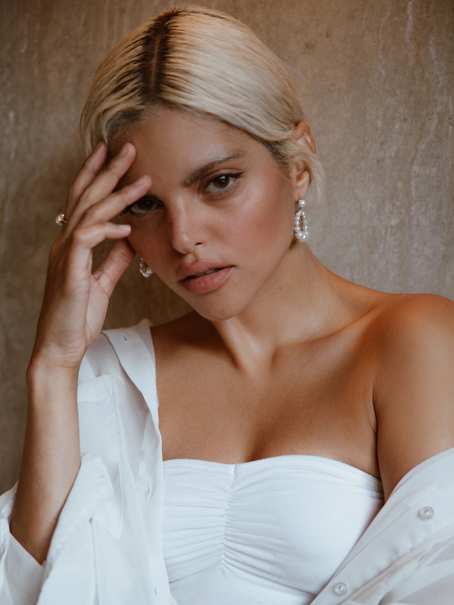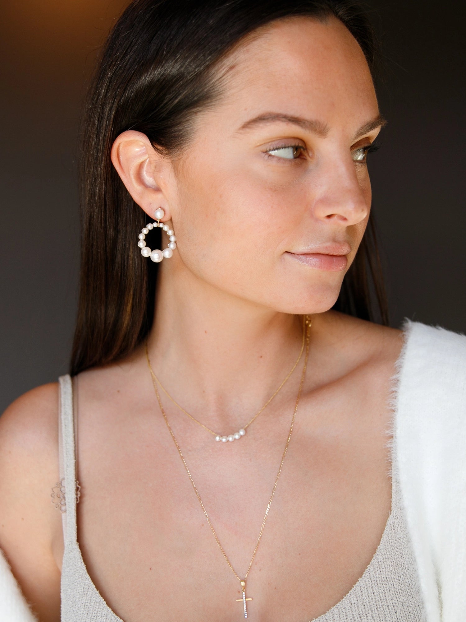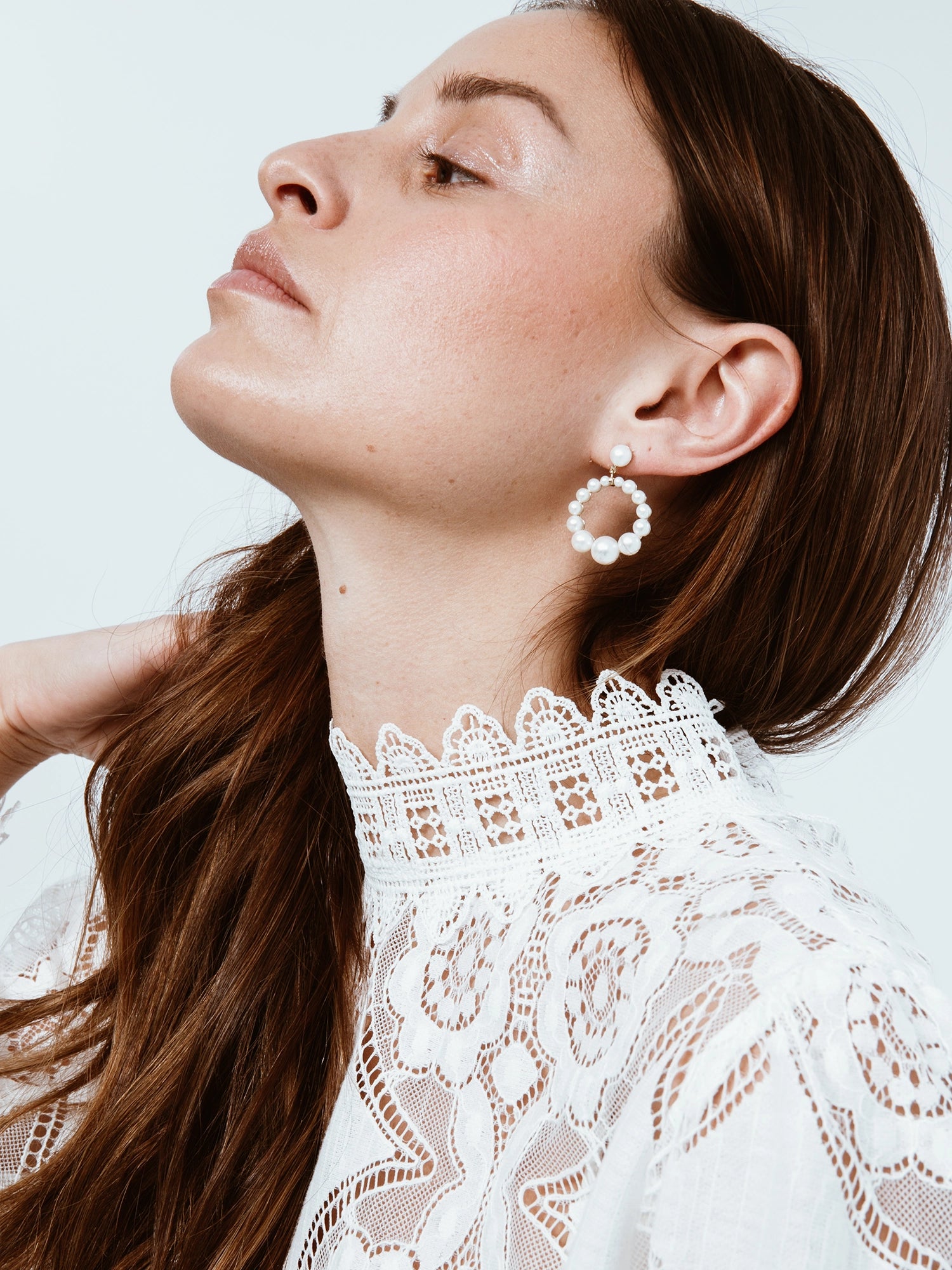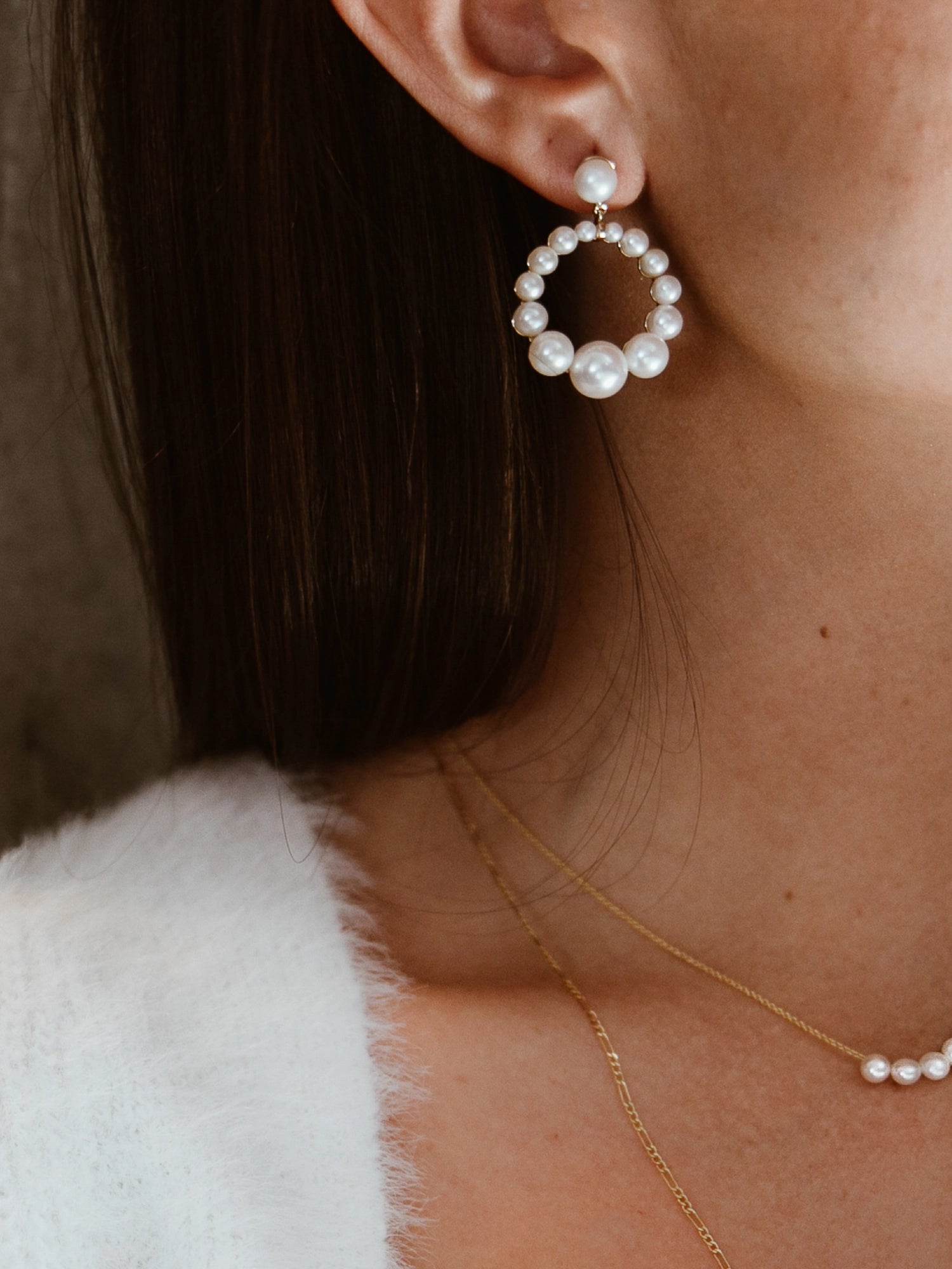 A simple pearl stud wasn't enough for this elegant Olivia look. To finish the design, a full circle of beautiful freshwater cultured pearls is creating a never-before-seen accessory.