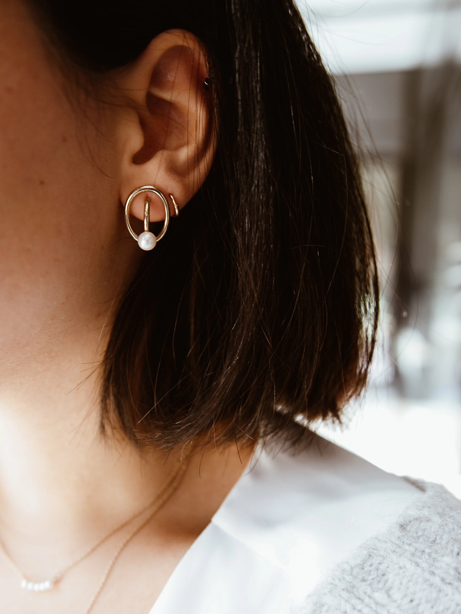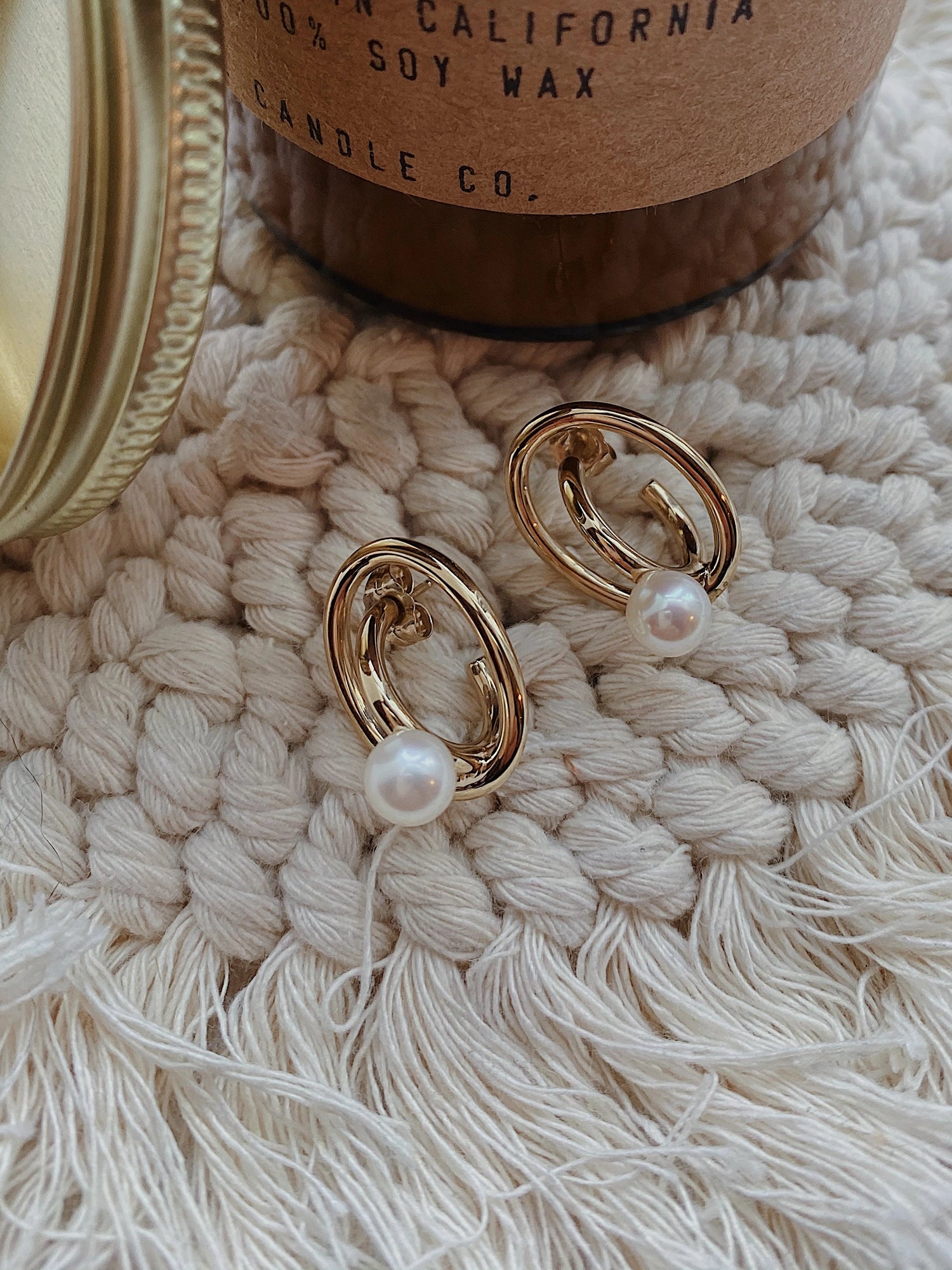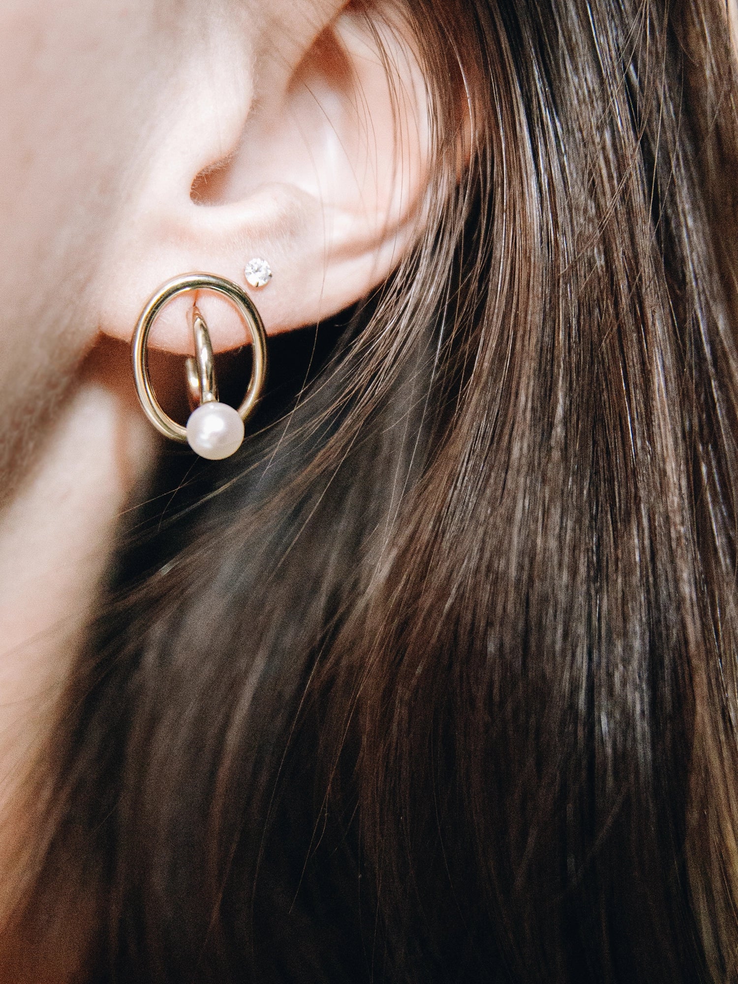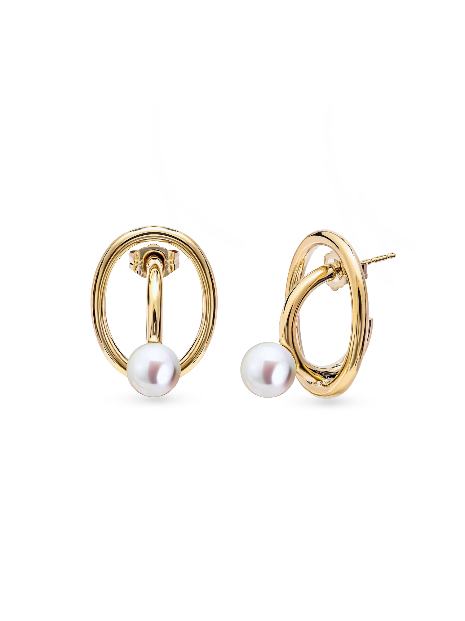 Accentuate your classic style with a modern touch; a freshwater pearl decorates this elliptical orbit design to catch the gaze of those around you.