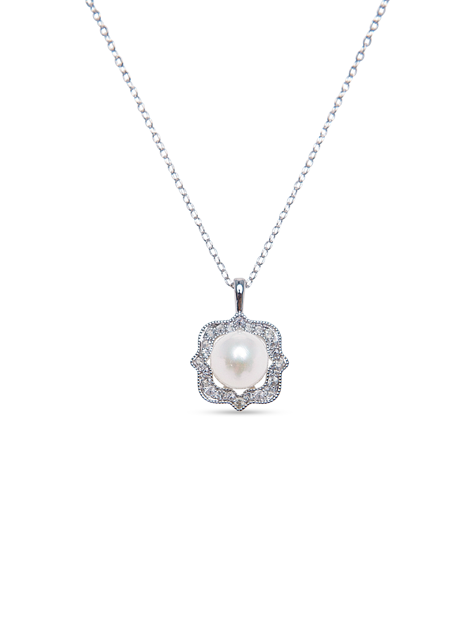 Modern sophistication meets classic elegance in this freshwater cultured pearl and topaz pendant. A princess halo design that's simply captivating.