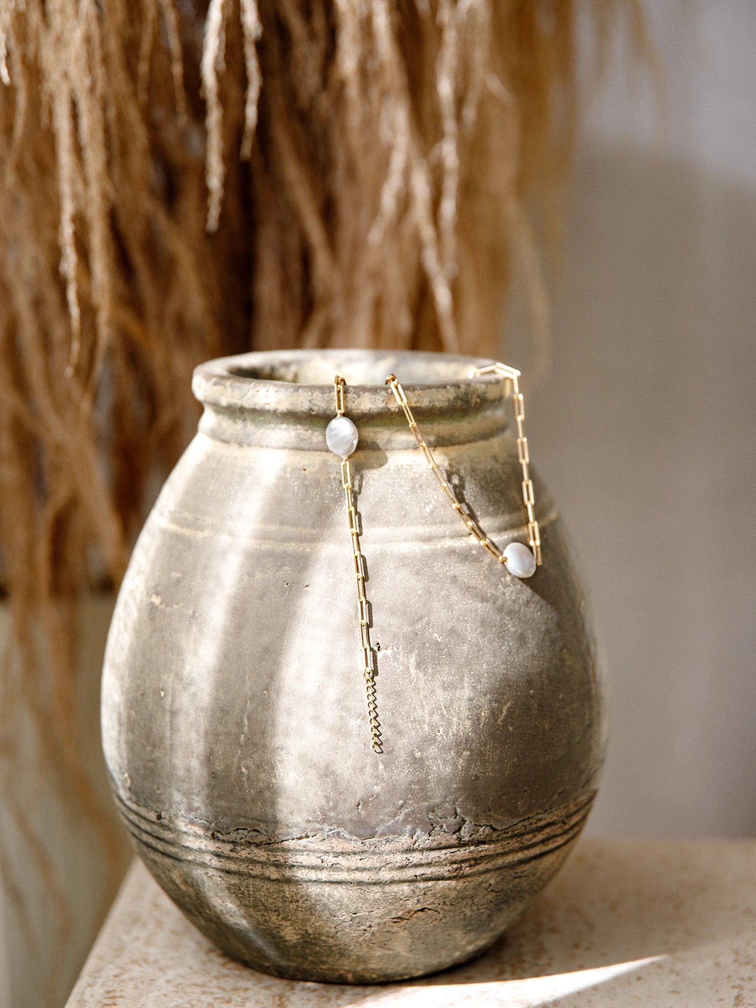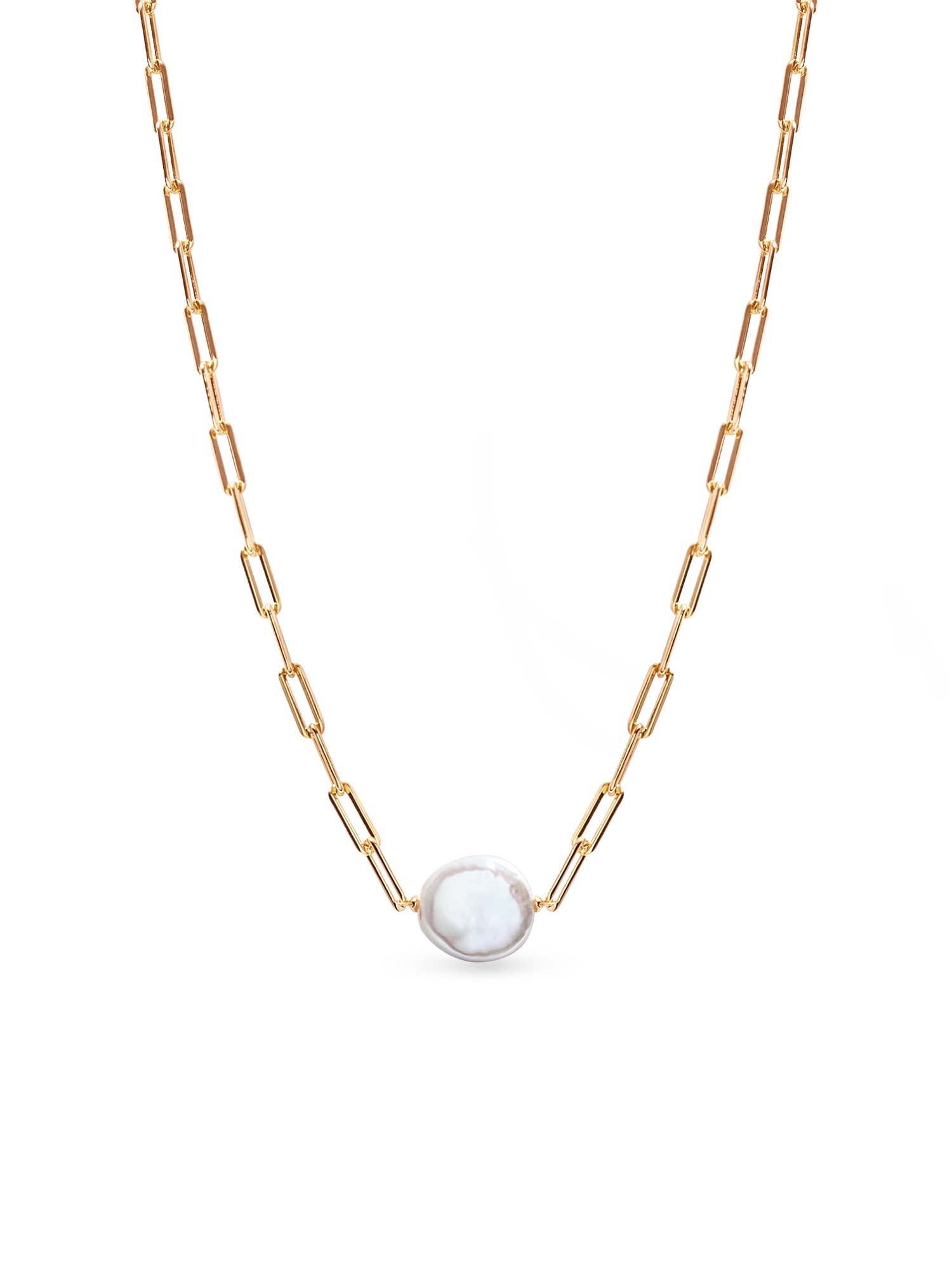 Balance in beauty: The Sasha necklace gracefully connects the feminine essence of a coin pearl with the boldness of a vermeil paperclip chain. Whether you layer it for a unique twist or wear it solo, it's a perfect statement piece.