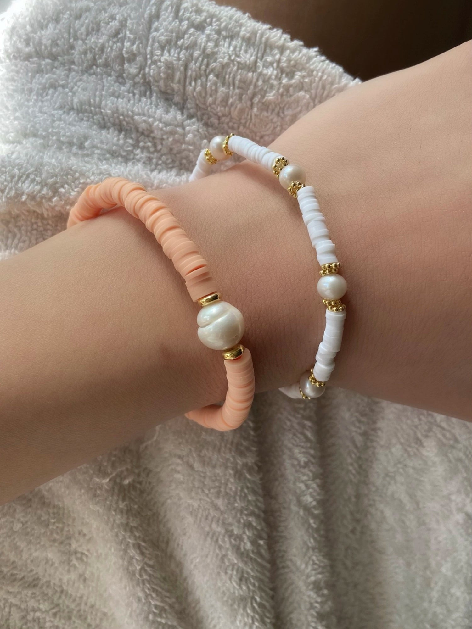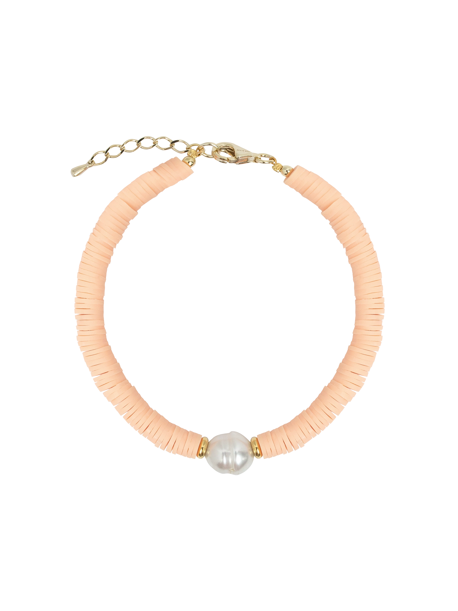 Get ready for golden hour with our one and only Solana. Featuring light papaya hued clay beads and a circled pearl with gold plated beads on both sides. Wear alone or stack it for the perfect summer vibe!