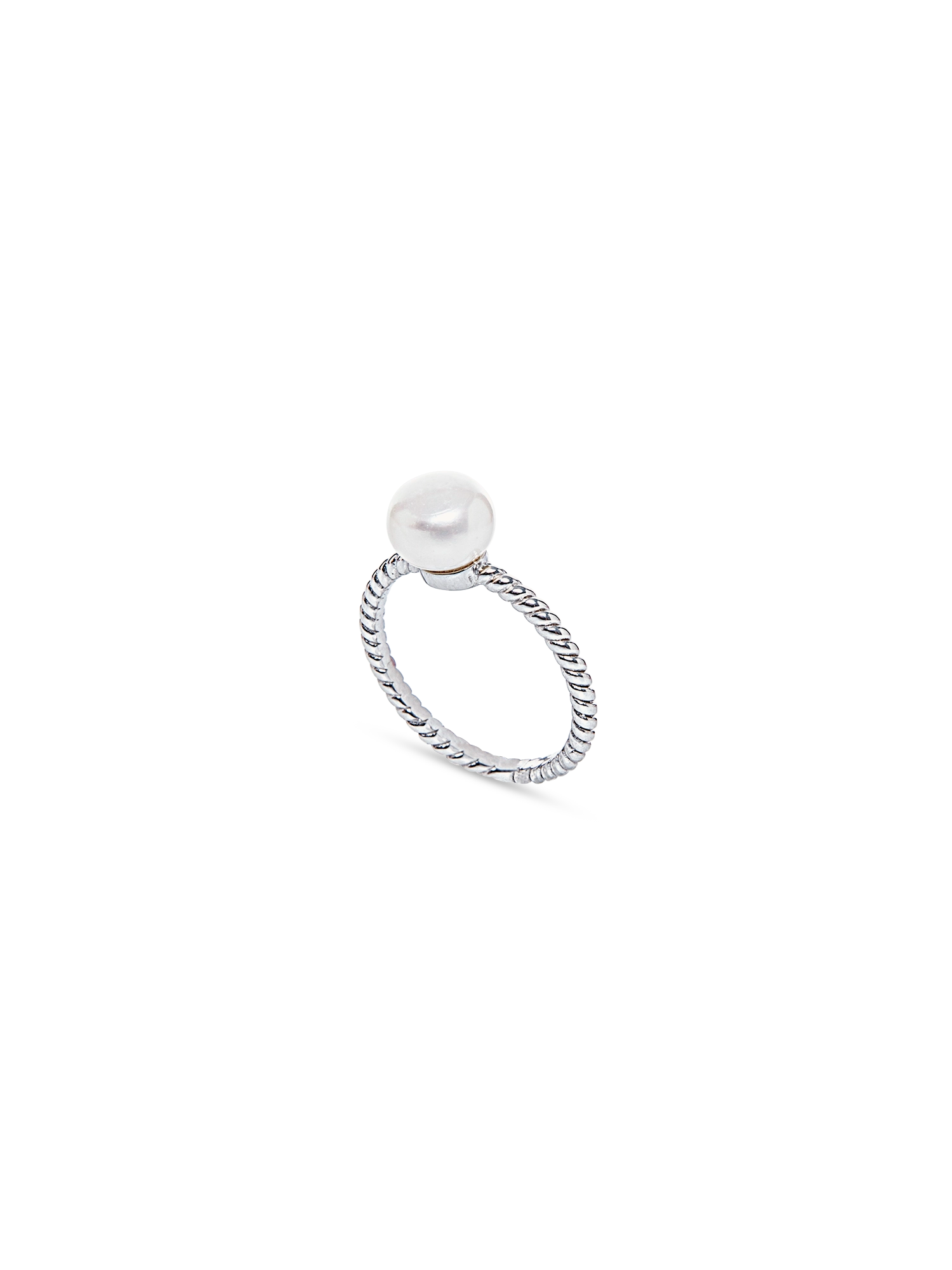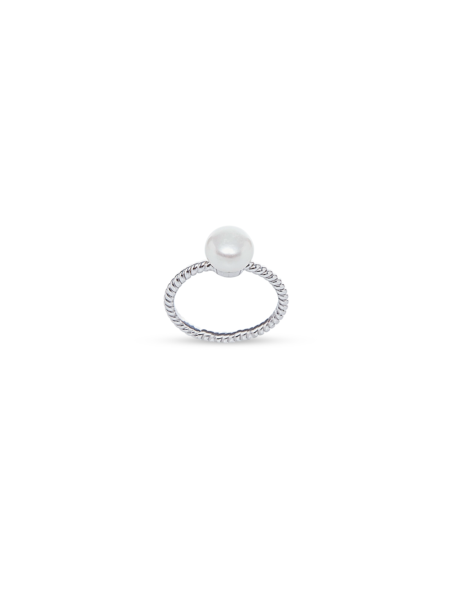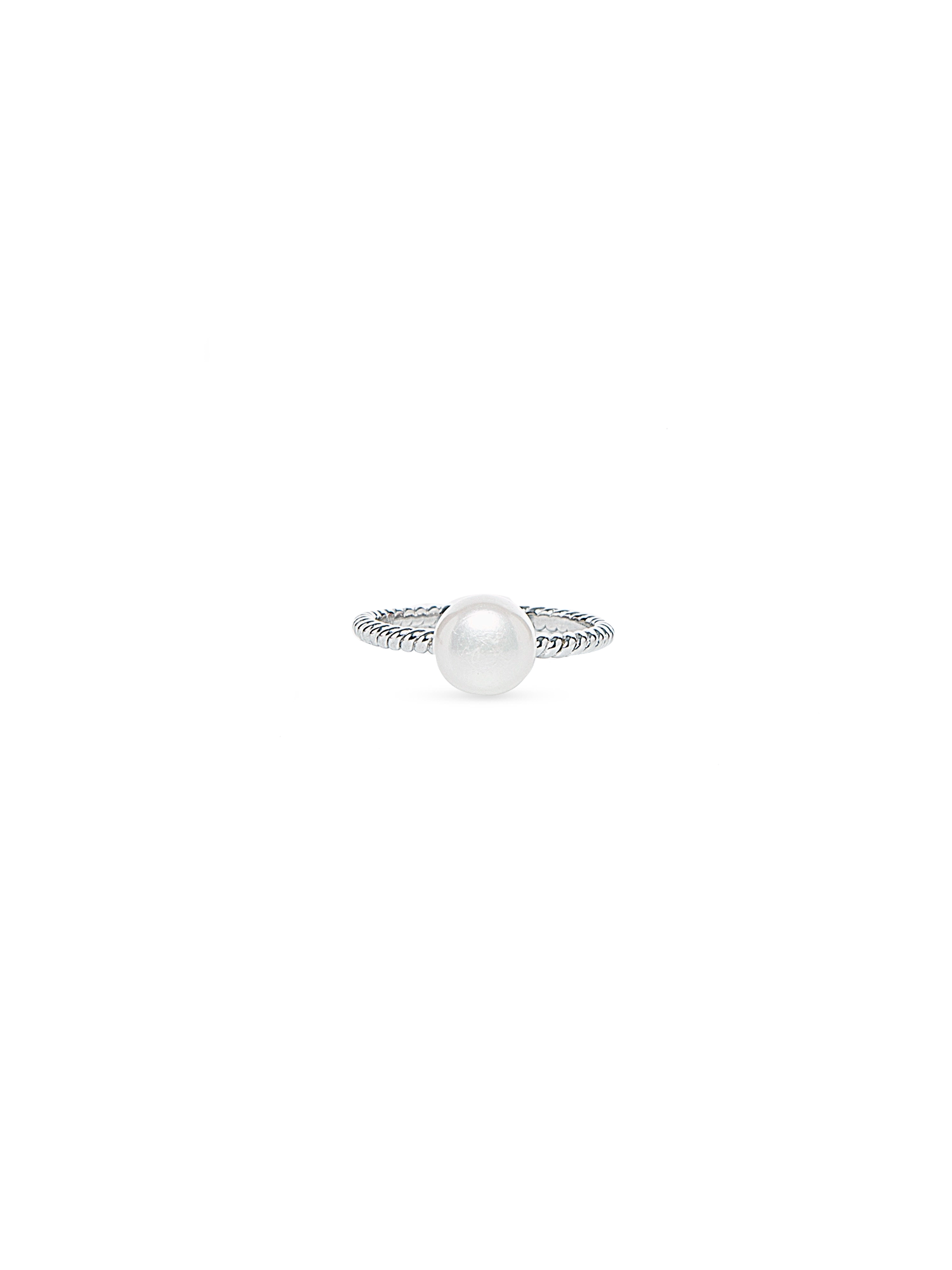 A unique twist on a timeless treasure. The intertwining silver band creates visual contrast, adding a touch of modernity to the classic pearl and making it ideal for stacking.