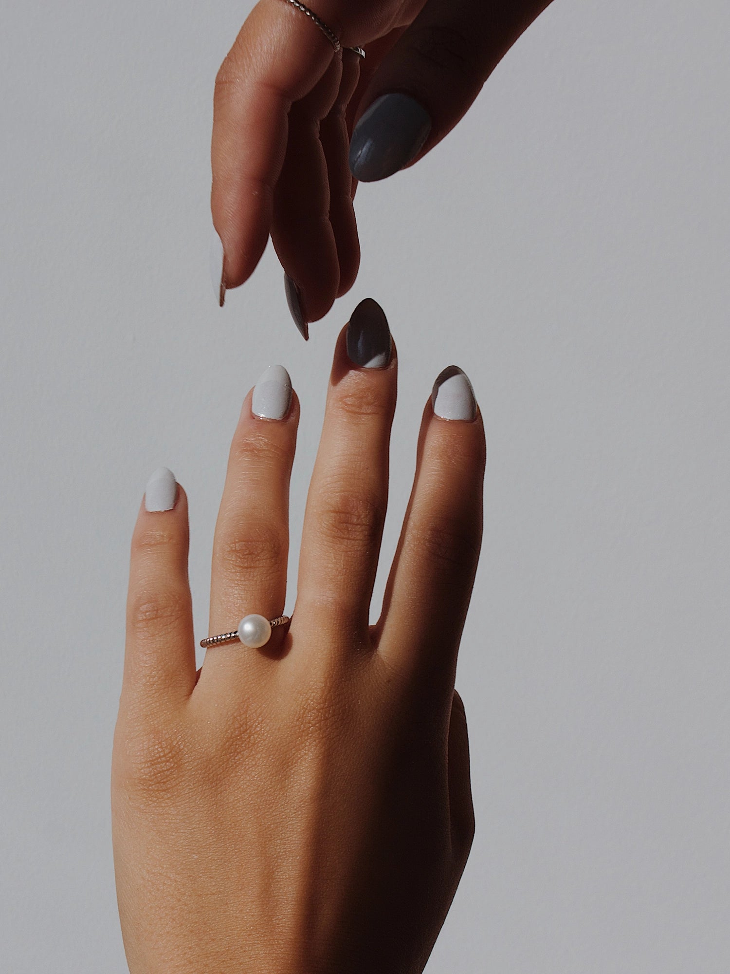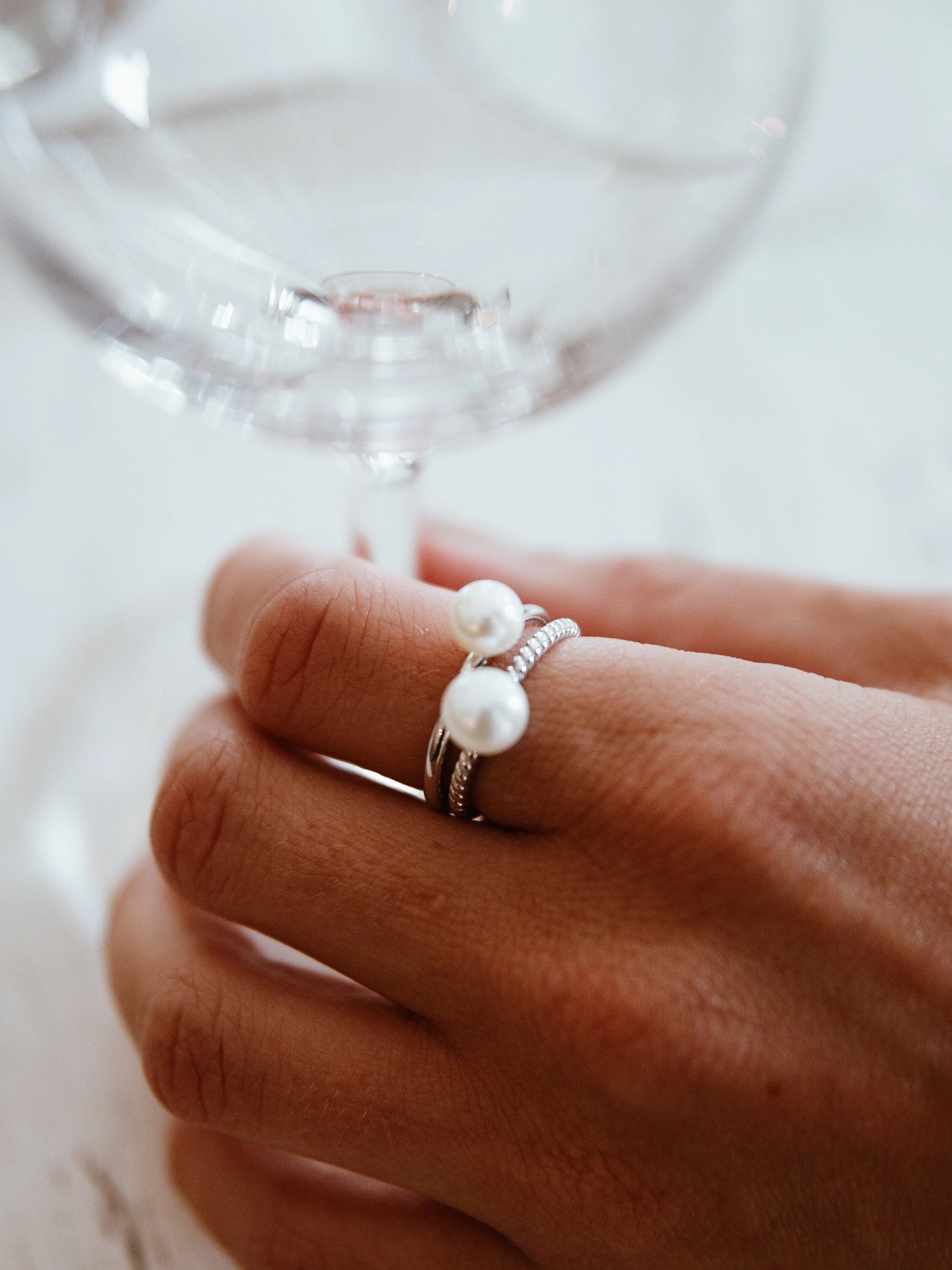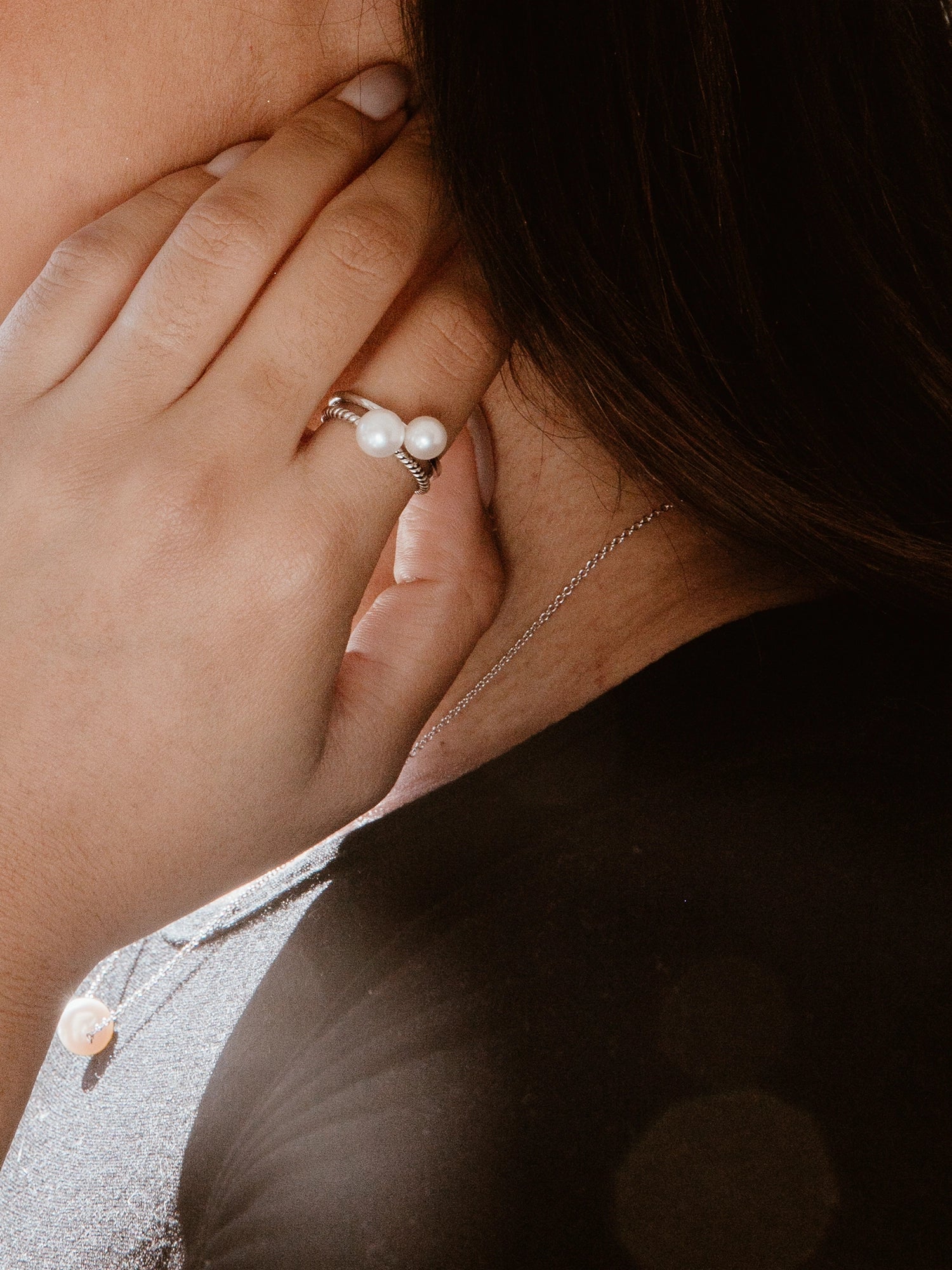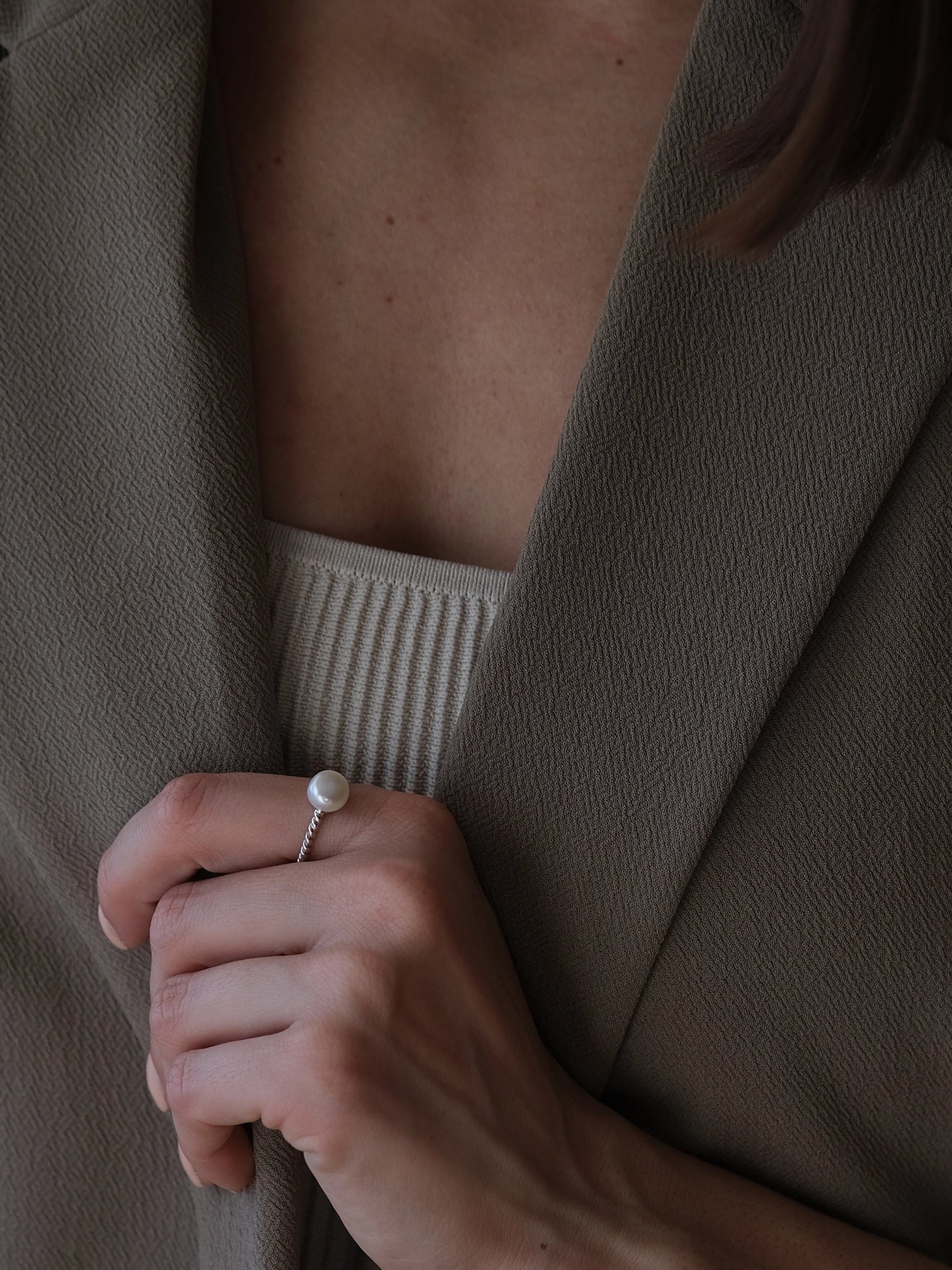 A unique twist on a timeless treasure. The intertwining silver band creates visual contrast, adding a touch of modernity to the classic pearl and making it ideal for stacking.